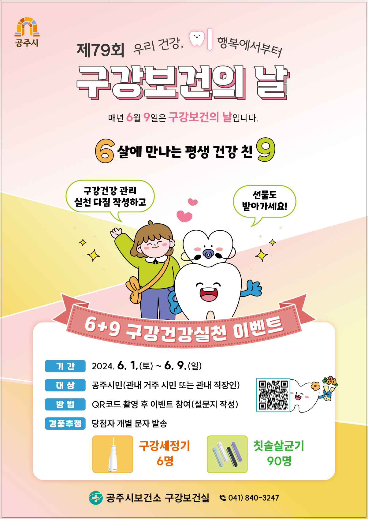 | 336 | 제79회 구강보건의 날 기념 『6살에 만나는 평생 건강 친9, 6+9 구강건강실천 이벤트』 알림 | 건강관리과 | 559 | 2024-05-30 | 구강보건의날 이벤트.jpg |