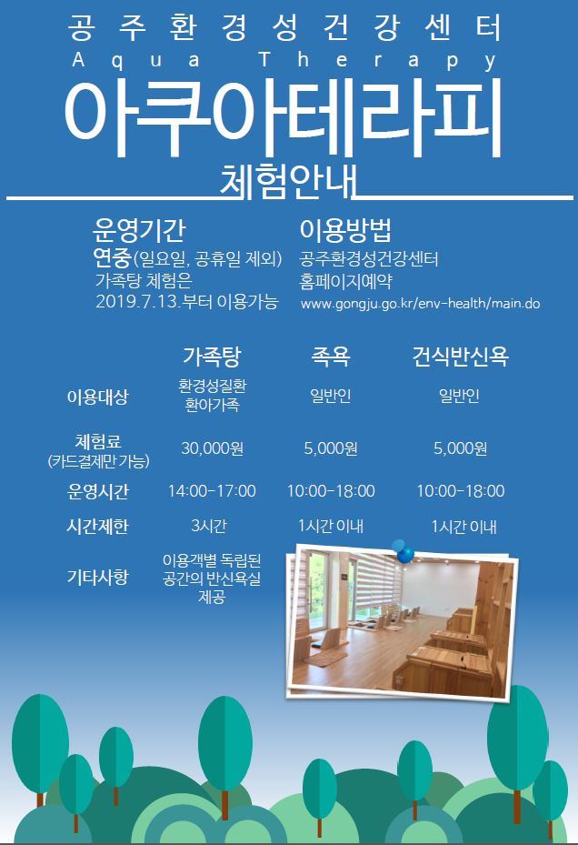 | 30 | 공주환경성건강센터 아쿠아테라피 체험프로그램 운영 알림 | 환경성건강센터 | 473 | 2019-07-08 | 아쿠아.JPG |