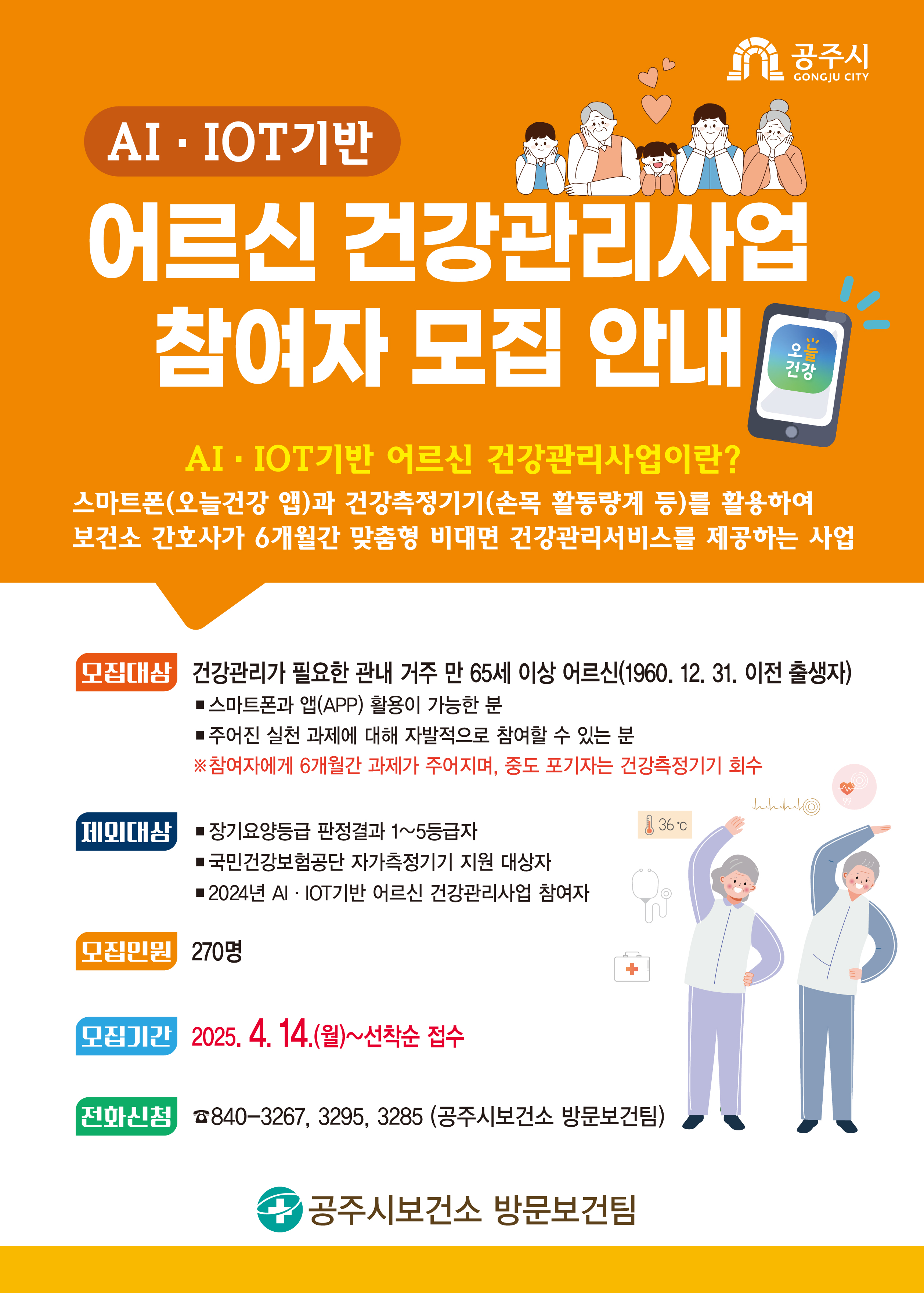 | 375 | 2025년 AI·IOT기반 어르신 건강관리사업 참여자 모집 안내 | 건강관리과 | 1,073 | 2025-04-03 | 모집 안내문.jpg |