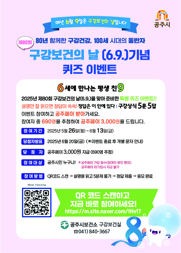 | 381 | 제80회 구강보건의 날 기념 퀴즈 이벤트 안내 | 건강관리과 | 1,189 | 2025-05-29 | 이벤트 전단지 시안.jpg |