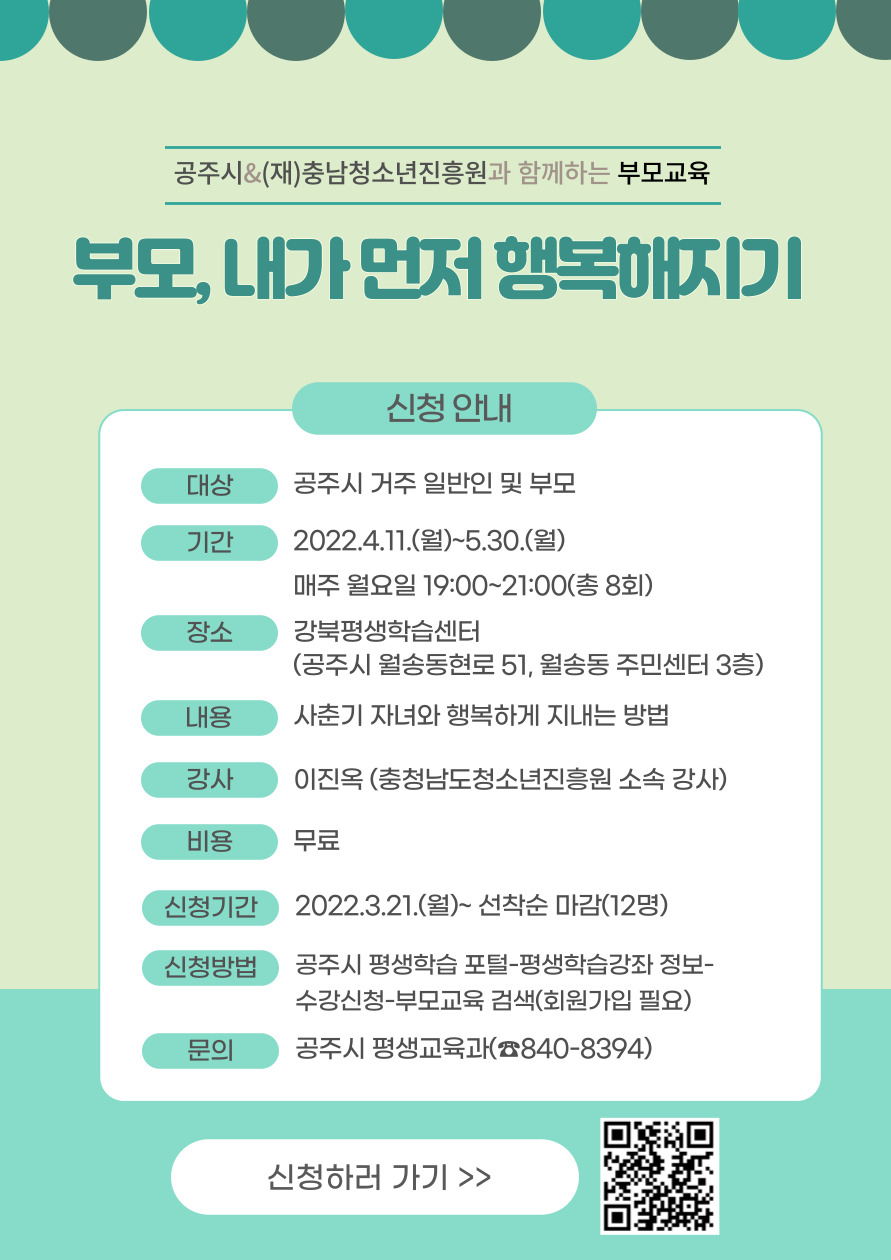 | 강좌명 | 부모교육-부모, 내가 먼저 행복해지기 | 교육기간 | 2022-04-11~ 2022-05-30 |