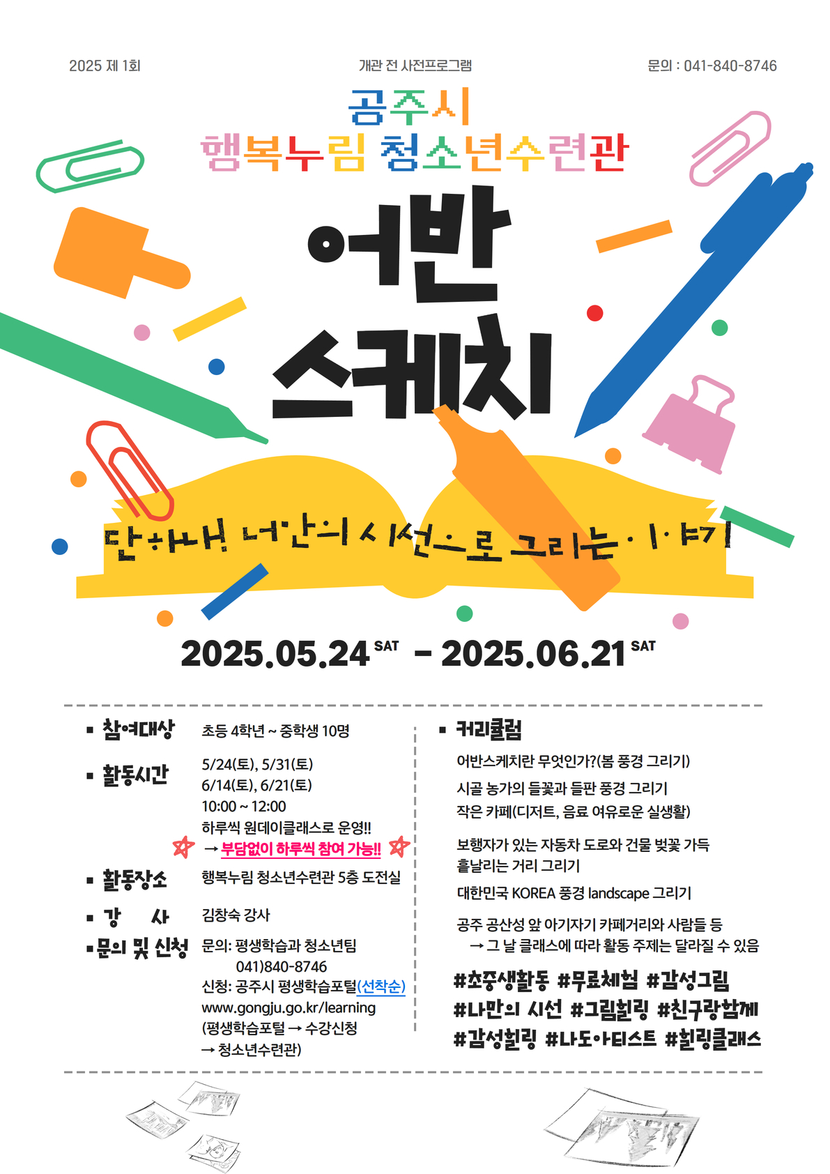 | 강좌명 | (원데이)공주의 골목을 그리며, 나를 그리다!(어반스케치) | 교육기간 | 2025-05-31~ 2025-05-31 |